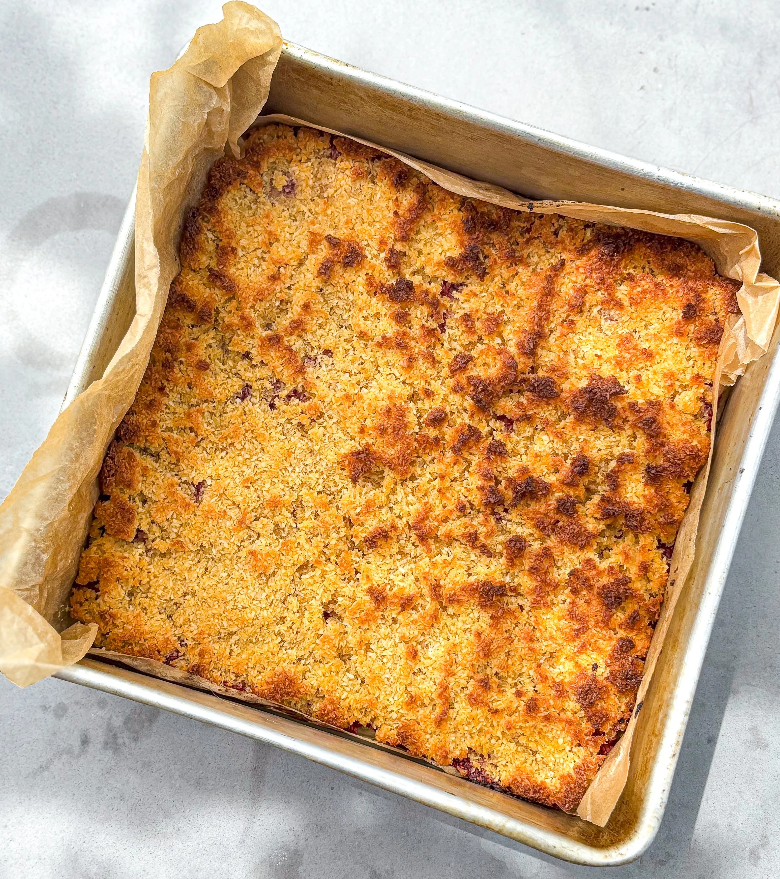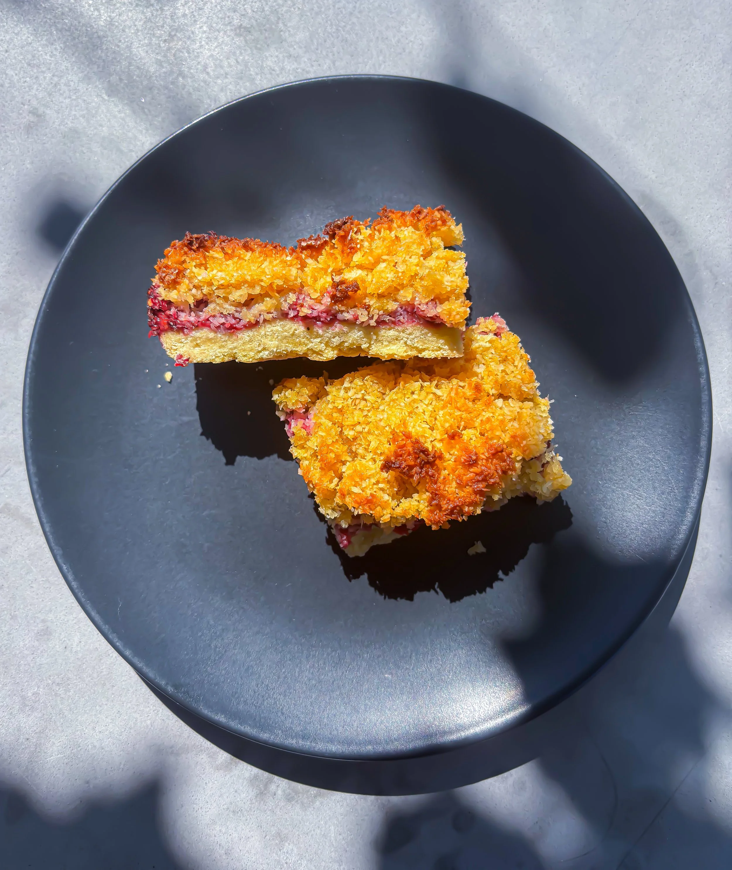 A wholesome, nutrient-rich treat with a buttery base, chia raspberry jam, and a coconut protein topping.